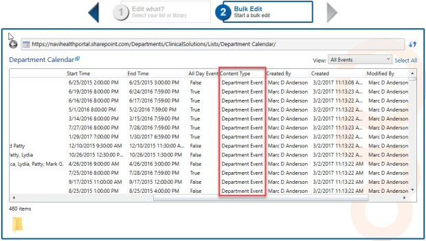 Anyway, today I needed to change the Content Type on a LOT of events in a calendar. We often create a new Content Type based on Event which has a few extra column. Most often they are things like Show on Home Page? or Department Name, especially in an Intranet. In this case, that Content Type is called Department Event, and it lets us intelligently roll up those events on the Intranet home page.